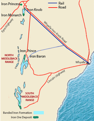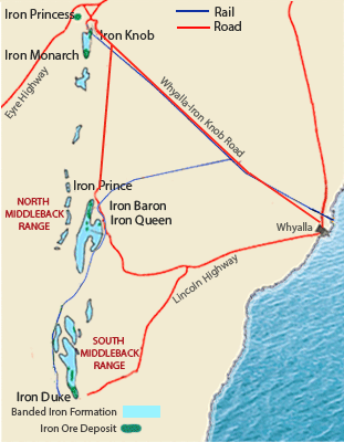 By the mid 1930s B.H.P. had either begun mining or pegged leases at, Iron Baron, Iron Queen, Iron Prince, Iron Duke, Iron Knight and Iron Duchess, all to the south of Iron Knob.