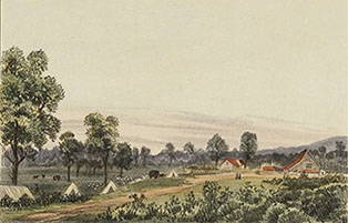 Colonial lithograph of Colonel William Light's camp and the first settlement in Adelaide on the banks of the Torrens River.