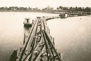 Milang jetty was built in 1856 and was increased in length twice more. The Port of Milang declined in importance after the line to Morgan in 1878 took away the upper Murray trade. This photograph shows rail tracks on the jetty, which dates the photograph after 1884.