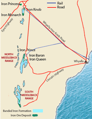 By the mid 1930s B.H.P. had either begun mining or pegged leases at, Iron Baron, Iron Queen, Iron Prince, Iron Duke, Iron Knight and Iron Duchess, all to the south of Iron Knob.
