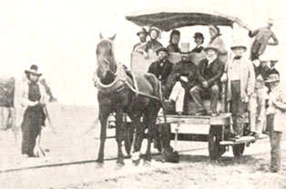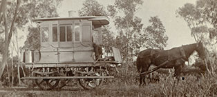 The Flying Scotchman Tramcar which ran between Mundoora and Port Broughton from March 11 1876. The tramcar was also known as the Pie Cart. The horse drawn carriage ran on rails. Courtesy SLSA